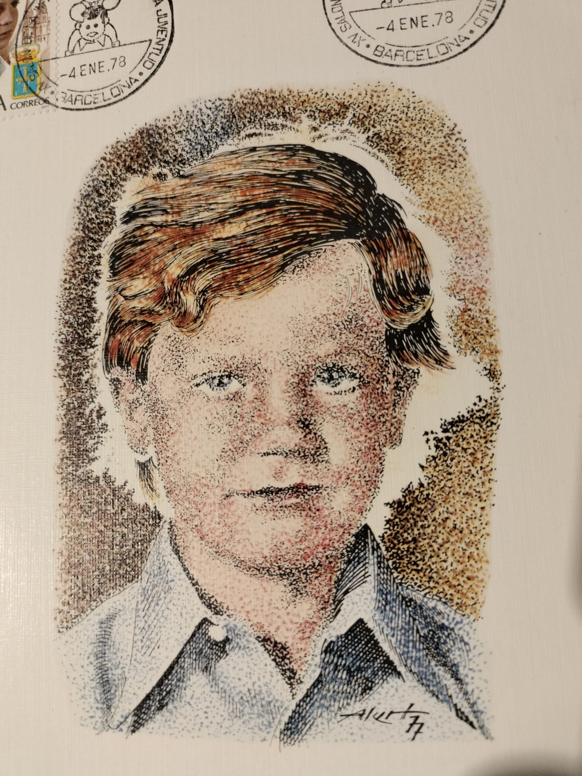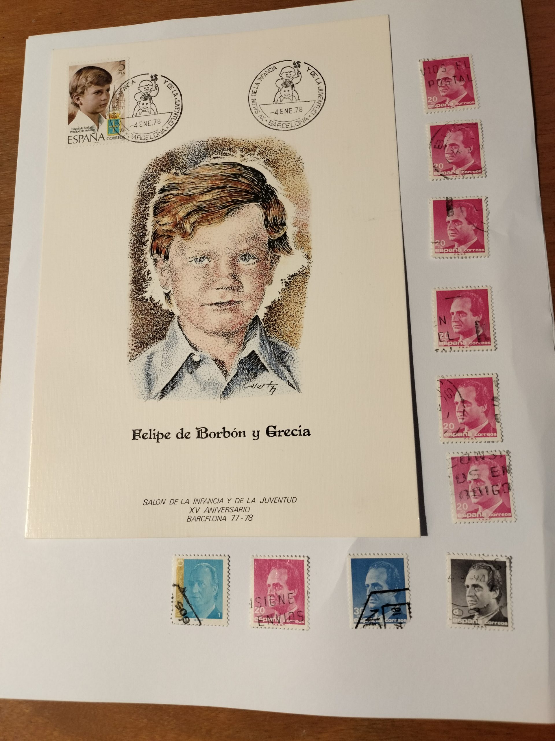 Tarjeta Postal Española, del salon de la iinfancia y la juventud XV aniversario Barcelona 77-78 en la que se observa un sello postal de 5 pesetas, con la imegen de un infante, es Felipe de Borbon y Grecia , actual rey de esa nacion. Se incluyen 10 piezas filatelicas de sellos coon diferentes valores de 1, 8 20 y 30 pesetas indicadas como valor faciale, con la imagen de su señor padre Don Juan Carlos quien fue rey de España desde 1975 y hasta 2014, momento en que su Hijo Felipe asumio el simbolico cargo.